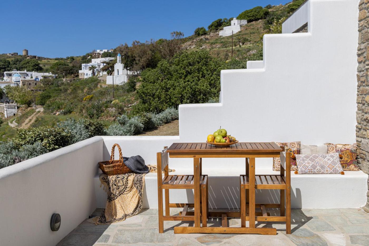 Apartment. Traditionally furnished apartment with iron beds and built-in sofas which leads to a furnished balcony overlooking Skalados Village. It offers: -well-equipped kitchenette -dining and living area -plasma TV -free WiFi -air conditioning.